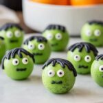 Now the fun really begins! While the coating is still tacky, press candy eyes onto each ball to create the character’s signature stare. Use black decorating gel or icing to draw on a mouth and iconic bolts on the sides. Sprinkle chocolate sprinkles on top for “hair” to complete the classic Frankenstein look that’s both cute and spooky.