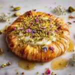 This Garden Party Baked Brie Tart is an elegant and easy-to-make appetizer featuring creamy brie wrapped in flaky puff pastry, drizzled with honey, and topped with crunchy pistachios and edible flowers. Perfect for spring or summer entertaining, this tart offers a delightful balance of rich, sweet, and nutty flavors with a stunning presentation.