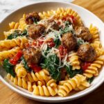 This Irresistible Garlic Butter Rotini with Beef & Italian Sausage is a hearty and flavorful pasta dish that combines savory ground beef and Italian sausage with a rich garlic butter sauce, fresh spinach, and tender rotini pasta. Perfect for a comforting weeknight dinner, this recipe offers balanced textures and delicious layers of taste with the option to customize ingredients for dietary preferences.