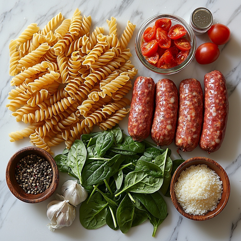 The beauty of this Garlic Butter Rotini with Beef and Italian Sausage Recipe is in its simplicity. A handful of basic, wholesome ingredients come together to create a dish bursting with richness, color, and perfect texture. Each item plays a crucial role — from the tender, spiral-shaped rotini pasta that holds onto every bit of sauce, to the hearty mix of beef and sausage that gives it bold depth.
