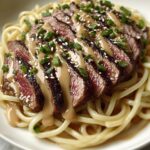This Garlic Butter Steak Lightning Noodles recipe combines tender, thinly sliced flank steak with savory garlic butter sauce and flavorful Asian-inspired seasonings, all tossed with tender egg noodles for a quick and delicious meal perfect for weeknights.