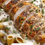 This Garlic Parmesan Chicken with Creamy Rigatoni Pasta recipe combines tender, juicy chicken breasts seared to golden perfection with a luscious, creamy Parmesan sauce tossed with al dente rigatoni pasta. Enhanced with garlic, Italian seasoning, and fresh parsley, this comforting dish is perfect for a satisfying weeknight dinner.