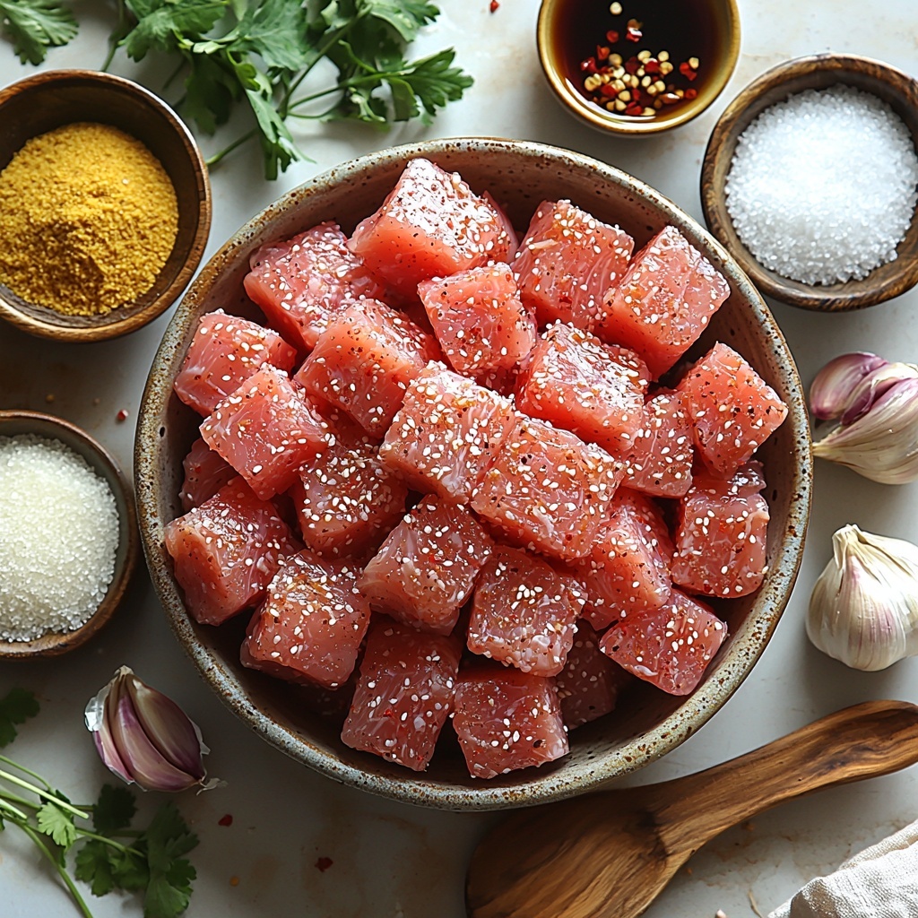In a bowl, combine low sodium soy sauce, rice vinegar, granulated sugar, minced ginger, minced garlic, and a sprinkle of red pepper flakes. Whisk everything together until the sugar dissolves fully so that the flavor melds beautifully. This blend will become the irresistible sauce that defines the dish.