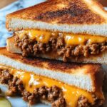 These Grilled Cheese Sloppy Joes combine the classic, savory sloppy joe filling with the crispy, cheesy goodness of a grilled cheese sandwich. Perfectly seasoned ground beef cooked with onions and green peppers is smothered in a tangy sauce, then sandwiched between buttery toasted bread with melted cheddar cheese for a comforting and satisfying meal.