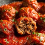 These Ground Beef Meatballs in Rich Tomato Sauce are a hearty and flavorful Italian-American main course. Juicy meatballs made from a blend of ground beef, breadcrumbs, Parmesan, and herbs are browned to perfection and then simmered in a thick, savory tomato sauce infused with garlic, onion, oregano, and a touch of red pepper flakes. This comforting dish is perfect served over pasta, rice, or with crusty bread, making it a satisfying meal for any occasion.
