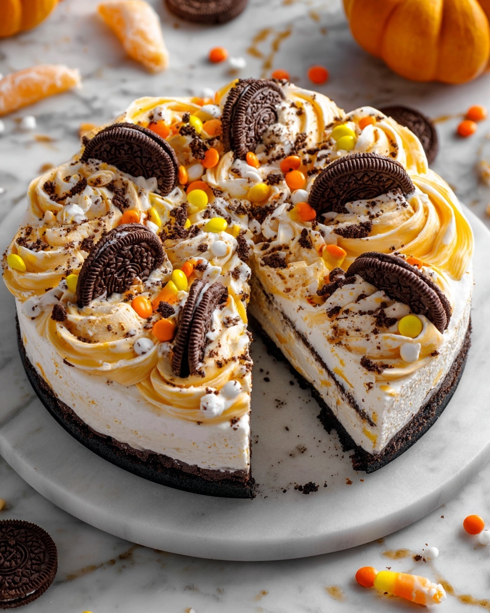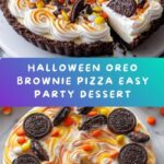 This Halloween Oreo Brownie Pizza is a festive and fun dessert perfect for spooky celebrations. A rich, fudgy brownie base is baked dark with optional black food coloring, then topped with colorful vanilla frosting tinted orange. The pizza is decorated with chopped Halloween Oreo cookies, themed candies like candy corn and gummy worms, and festive sprinkles to create a playful and delicious treat that serves 12 slices.