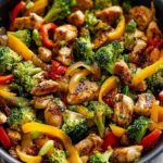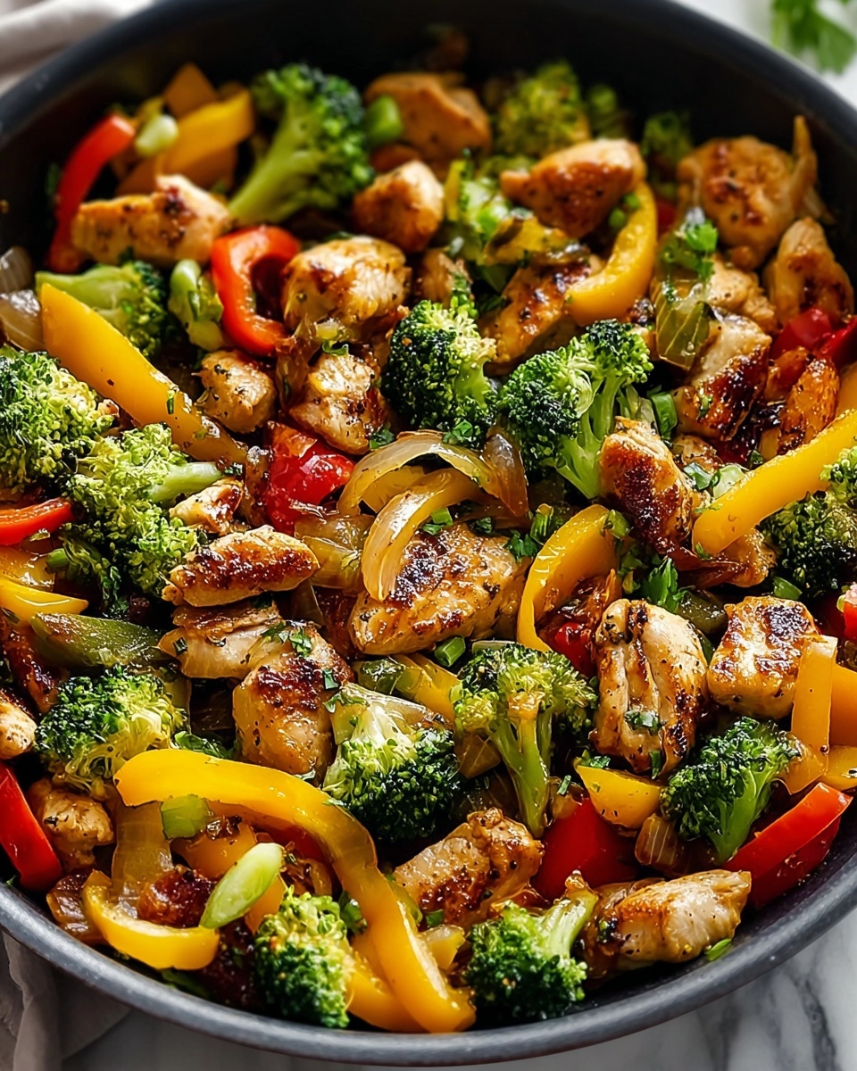 A quick and healthy chicken and vegetables skillet recipe featuring tender chicken strips sautéed with fresh broccoli, bell peppers, zucchini, and aromatic spices for a nutritious and flavorful meal perfect for busy weeknights.