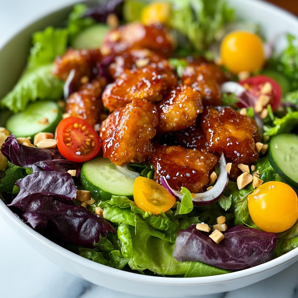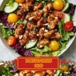 A flavorful Honey Hot Chicken Salad featuring tender grilled chicken breasts tossed in a spicy honey sauce over fresh mixed greens, cherry tomatoes, cucumber, and red onion, topped with crumbled blue cheese and crunchy pecans. This vibrant salad balances sweet, spicy, and savory flavors for a deliciously satisfying meal.