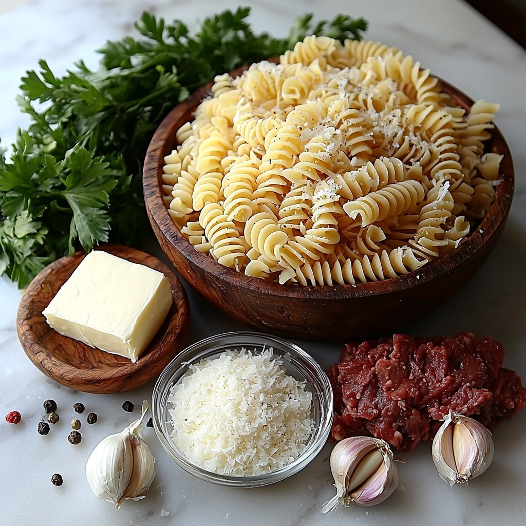 The beauty of this Indulgent Cheesy Rotini Pasta with Garlic Butter Sauce Recipe lies in its simplicity. Each ingredient is thoughtfully chosen to build layers of flavor and texture, whether it’s the tender rotini pasta or the fresh garlic that infuses the butter sauce with heavenly aroma.