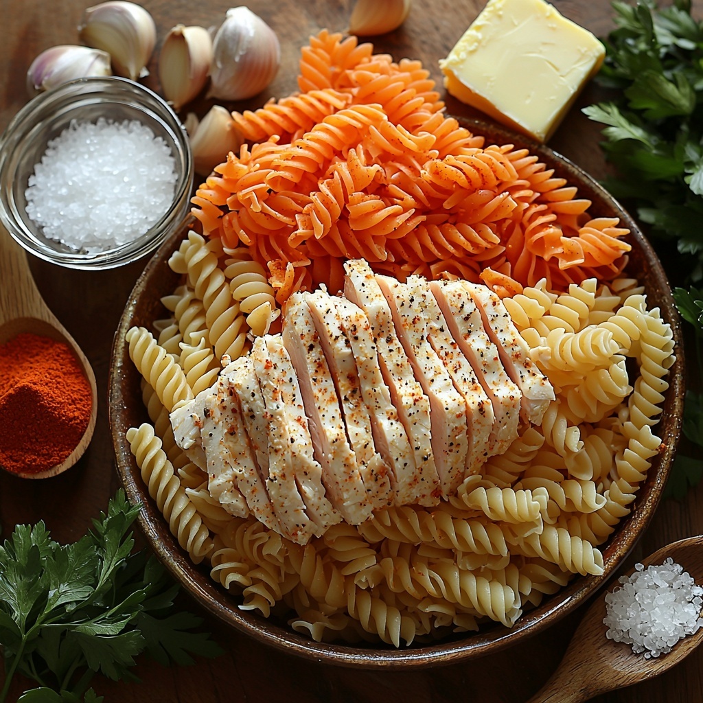 Simple ingredients come together in this recipe to create layers of rich, comforting flavors and textures. Each component plays a special role, from the spiral rotini that catches sauce in every twist to the perfectly seasoned chicken that brings protein and savoriness to the table.