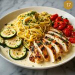 Add the drained fettuccine right into the skillet with the Alfredo sauce, tossing to coat every strand perfectly in that rich, cheesy goodness. Slice the rested chicken and arrange it on plates alongside the roasted Parmesan zucchini. Top each serving with a generous dollop of the roasted red pepper whipped feta to crown this unforgettable dish.