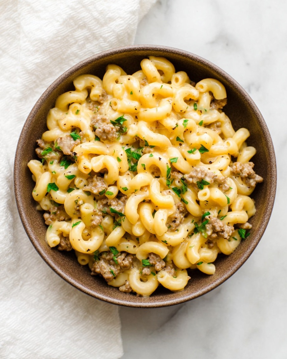 Want to impress guests or make this comforting meal extra special? Serve your hamburger mac and cheese in individual ramekins topped with toasted breadcrumbs or even crispy bacon bits. For a fun twist, consider adding sautéed mushrooms or caramelized onions mixed in before serving.