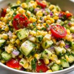 A fresh and vibrant corn salad packed with sweet corn, crisp bell pepper, cool cucumber, and a zesty lime dressing. This easy no-cook salad is perfect as a light side dish or a healthy snack, bursting with refreshing flavors and a delightful crunch.