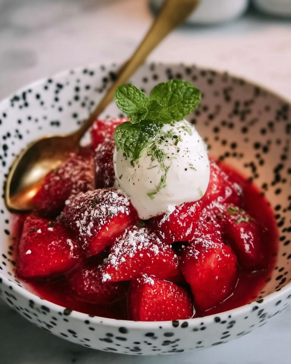 A sprinkle of fresh mint leaves adds not only a vibrant pop of color but also a cool, refreshing flavor contrast that brightens the rich sweetness of the macerated strawberries.