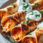 Lay out each tortilla flat, then spoon about 2 to 3 tablespoons of the buffalo chicken mixture down the center. Sprinkle some shredded cheddar and mozzarella cheeses directly on top of the filling for that dreamy cheesy stretch. Roll the tortilla up tightly around the filling and place it seam-side down on your baking sheet to keep it secure. Repeat until all tortillas are filled and rolled.