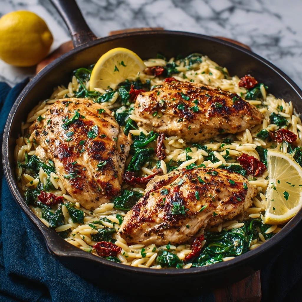 This Lemon Herb Chicken & Orzo with Spinach recipe is a vibrant, healthy meal combining tender marinated chicken with flavorful orzo pasta and fresh baby spinach. Enhanced with zesty lemon, aromatic herbs, and optional Mediterranean touches of feta cheese and sun-dried tomatoes, it’s perfect for a quick weeknight dinner or meal prep.