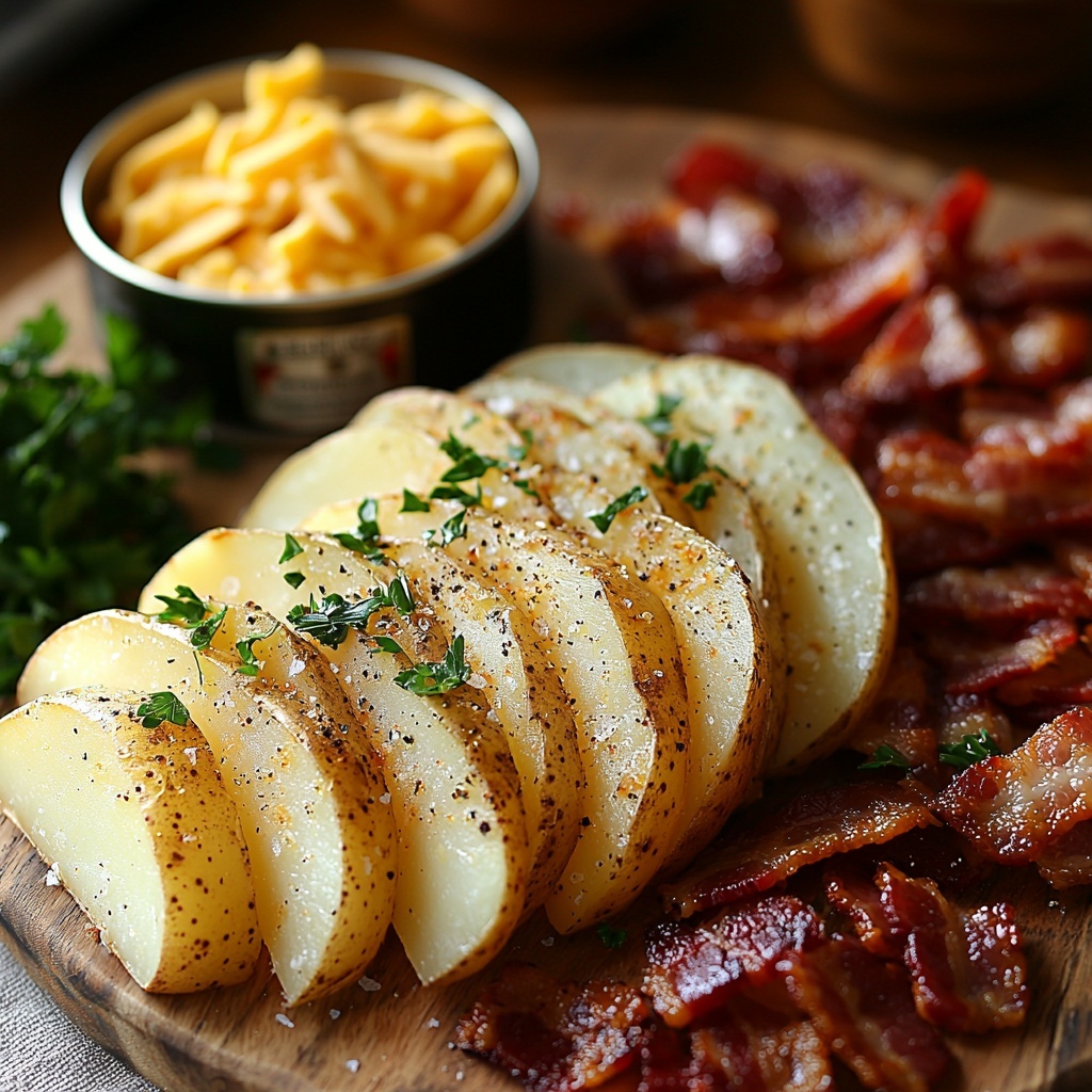 - Add toppings: Evenly sprinkle shredded Colby Jack cheese over the potato slices, then top with crumbled bacon if using.