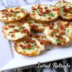 These Loaded Baked Potato Rounds are crispy, cheesy, and topped with savory bacon for a delicious appetizer or snack. Thinly sliced russet potatoes are parboiled, baked with melted Colby Jack cheese and crumbled bacon, then garnished with fresh herbs. A perfect finger food with an easy vegetarian option by omitting bacon.
