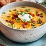 Ladle the soup into bowls and top generously with crumbled bacon, extra cheddar cheese, dollops of sour cream, and a sprinkle of chopped green onions. This final flourish not only makes the soup look irresistible but adds layers of texture and flavor that complete the experience.
