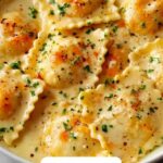 Reheat gently on the stovetop over low heat, stirring often to prevent the cream sauce from separating. You can add a splash of water, broth, or cream if the sauce has thickened too much. Avoid using high heat or the microwave to keep the delicate texture of both ravioli and sauce intact.
