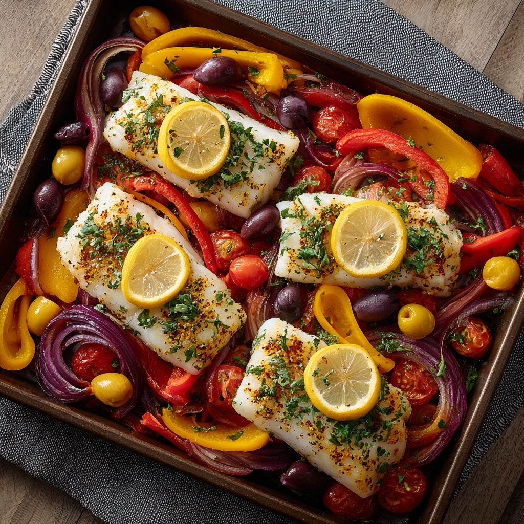 For a festive presentation, serve the fish and vegetables family-style right from the baking dish at the table. Alternatively, plate individual servings on bright ceramic dishes and drizzle a little extra olive oil and lemon juice to bring out the flavors. Adding edible flowers or microgreens can elevate the look for special occasions.