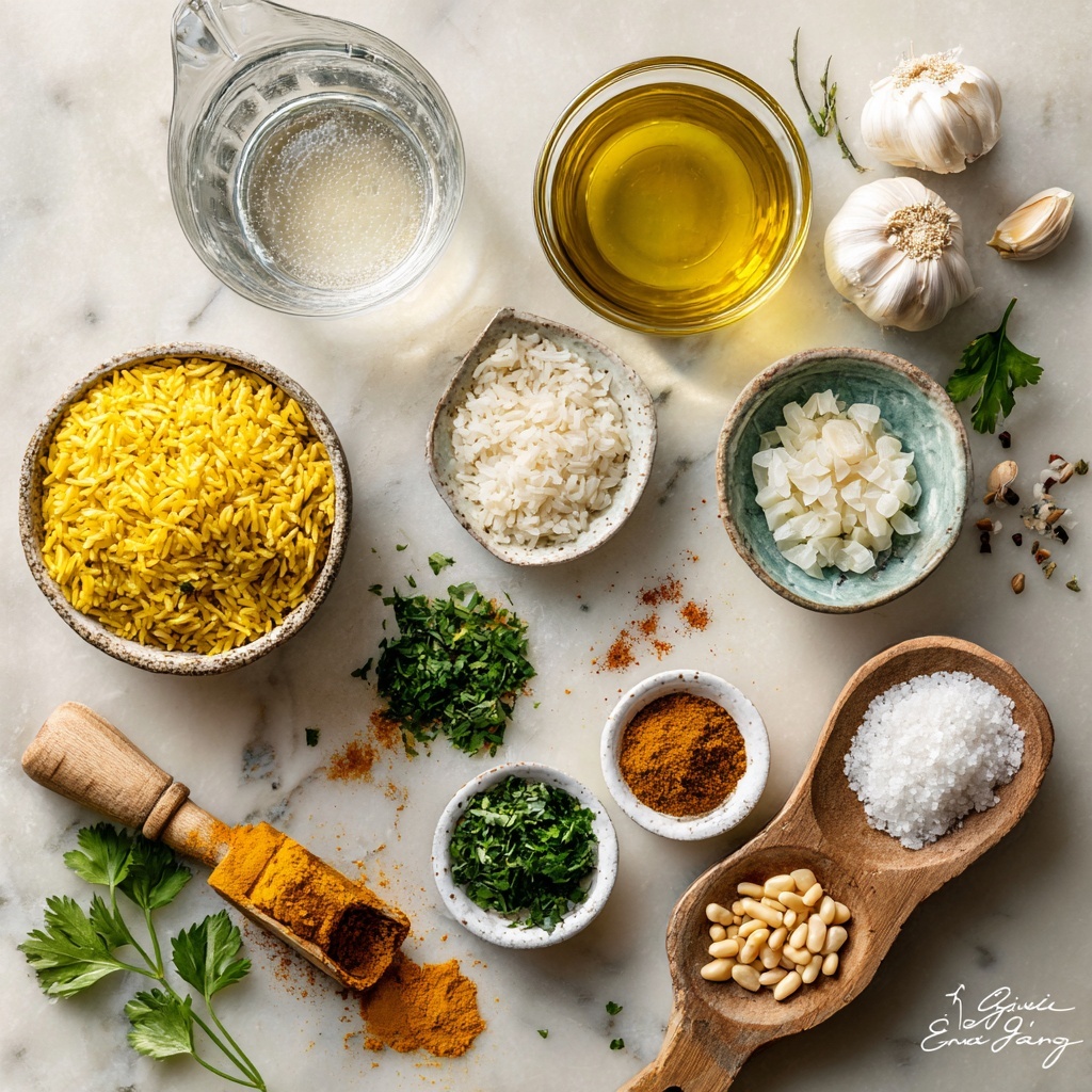 Getting the ingredients right is key, but don’t worry—these essentials are simple, easy to find, and each one plays an important role in shaping the taste and color of this dish. From the aromatic olive oil to the golden turmeric, every component adds its own special touch.