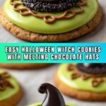 Melted Witch Cookies are whimsical Halloween-themed treats featuring soft, buttery cookies topped with a green, melted white chocolate ‘puddle,’ a miniature peanut butter cup hat, and a chocolate kiss candy, decorated with festive sprinkles and black gel for a spooky yet delicious holiday dessert.