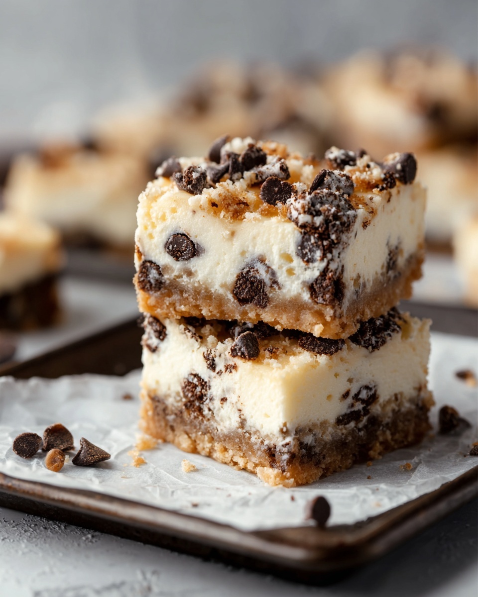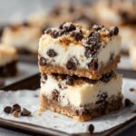 Delicious no-bake cookie dough cheesecake bars combining a rich, buttery cookie dough base with a creamy cheesecake topping studded with mini chocolate chips. Perfect for a sweet treat without turning on the oven, these bars set in the refrigerator to create a firm, indulgent dessert that’s easy to prepare and sure to impress.