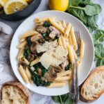 - Cook the Pasta: Transfer the mushroom and spinach mixture to a serving plate and set aside. In the same pan, add the dry penne pasta along with 3 cups of water and a generous pinch of salt. Bring to a simmer over medium heat and cook, stirring occasionally, for about 10 minutes or until the water is mostly absorbed and the pasta is al dente.