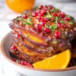For a festive presentation, serve the ham on a platter lined with fresh orange slices and garnished with extra pomegranate seeds and sprigs of parsley. You can also create individual servings by placing a slice of ham on salad greens topped with pomegranate seeds and a light vinaigrette for a refreshing holiday starter.