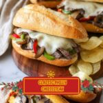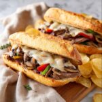This Philly Cheesesteak recipe features thinly sliced ribeye or sirloin steak cooked with sautéed bell peppers, onions, and cremini mushrooms, all melted under provolone cheese and served in toasted hoagie rolls. A classic, flavorful sandwich perfect for a hearty meal.