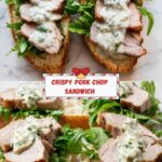 This Pork Chop Sandwich recipe features tender, juicy boneless pork chops seared to perfection and served on toasted baguette bread with fresh arugula and a flavorful basil lemon aioli. The combination of whole-grain mustard, creamy aioli, and zesty lemon juice enhances the savory pork, making it a delicious and satisfying sandwich perfect for a quick lunch or casual dinner.