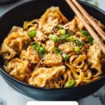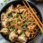 This Potsticker Noodle Bowl recipe features tender ground chicken, flavorful lo mein noodles, and a vibrant mix of fresh vegetables all tossed in a savory sauce made with chicken broth, soy sauce, garlic, ginger, and a touch of apple cider vinegar. Quick to prepare and perfect for a satisfying weeknight meal, this dish combines the comforting flavors of Asian-inspired ingredients with the ease of cooking everything in one skillet.