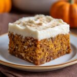 - Frost the bars: Spread the cream cheese frosting evenly over the cooled pumpkin bars using a spatula or knife.