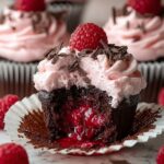 These Raspberry Chocolate Lava Cupcakes feature a moist, rich chocolate cake with a gooey raspberry preserve center. Topped with a luscious raspberry buttercream and garnished with fresh raspberries and dark chocolate shavings, they offer a perfect balance of sweet and tart flavors—ideal for any chocolate and berry lover.