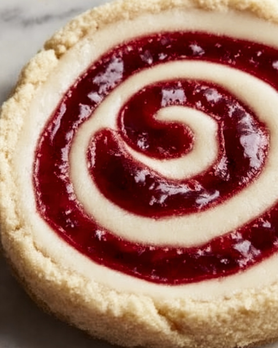 Raspberry Swirl Shortbread Cookies are buttery, tender cookies featuring a delightful swirl of sweet raspberry jam and a decorative drizzle of melted white chocolate. These cookies offer a perfect balance of rich shortbread texture with fruity and creamy highlights, making them a delicious treat for any occasion.