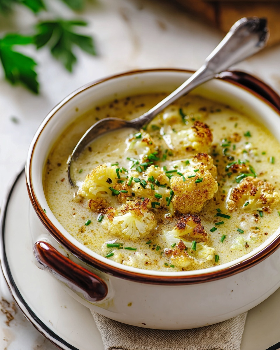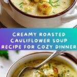 Pour your piping hot bowl of Roasted Cauliflower Soup Recipe into serving bowls and sprinkle with fresh chives or parsley. This simple garnish adds a fresh, bright finish, making every spoonful feel extra special.