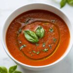 This Roasted Tomato Basil Soup is a warm and comforting dish featuring perfectly roasted tomatoes, garlic, and onions blended into a smooth, flavorful soup. Infused with fresh basil and optionally enriched with cream, it offers a balanced blend of sweetness, acidity, and aromatic freshness. Ideal for a cozy lunch or dinner, this recipe is simple to prepare and highlights the natural richness of ripe tomatoes.