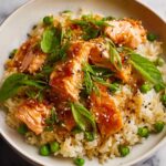 This Salmon Crispy Rice recipe combines perfectly seared salmon fillets with crispy pan-fried sushi rice cakes, enhanced by a savory soy-sesame glaze and a spicy mayo drizzle. Garnished with sliced avocado, green onions, and toasted sesame seeds, this dish offers a delightful mix of textures and flavors that make for an impressive and satisfying meal.