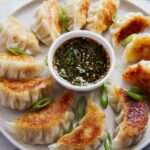 For a fun twist on tradition, arrange your gyoza in a circular pattern on a large platter with dipping sauces in the middle to create a centerpiece everyone can dive into. You can also skewer a few and serve them as finger food at parties with individual dipping cups of ponzu and chili oil — a guaranteed crowd-pleaser that’s both tasty and visually appealing.