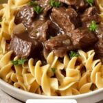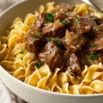 For a fun twist, serve the beef and noodles in elegant ramekins or shallow bowls to highlight the rich gravy and tender beef pieces. You could also layer the beef over the noodles in a clear casserole dish and sprinkle with breadcrumbs and cheese, then broil for a golden, crispy top for a comforting baked twist. Presentation is about making the meal feel as special as the flavors.