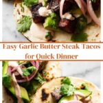 While the steak is basking in garlic butter, warm your corn tortillas on a dry skillet or in the microwave until soft and pliable. Now, build your tacos by layering the steak, dollops of chipotle mayo, pickled onions, avocado slices, and a sprinkle of cilantro. A squeeze of fresh lime brightens each bite, and then you’re set to enjoy!