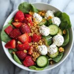 A refreshing and vibrant Strawberry Crunch Salad topped with tangy feta, toasted almonds, and a homemade champagne vinaigrette. Perfect as a light lunch or a delightful side dish.