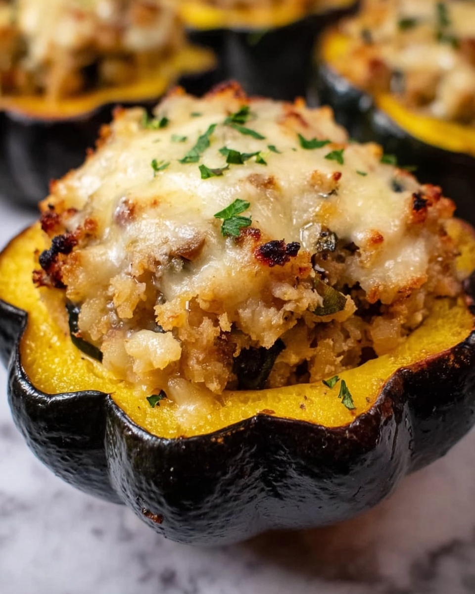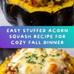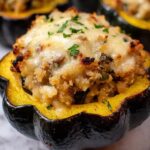 This stuffed acorn squash recipe is a cozy and flavorful fall dish perfect for a comforting meal. Roasted acorn squash halves are filled with a savory mixture of ground sausage, sautéed onions, apples, dried cranberries, nuts, quinoa or rice, and warming spices, then baked to perfection with a cheesy topping for an irresistible seasonal entrée.