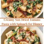 A creamy and flavorful Sun-Dried Tomato Pasta recipe featuring a rich sauce made with butter, garlic, white wine, cream, and parmesan, combined with fresh baby spinach and Italian seasonings. Perfect for a quick and satisfying dinner for four.