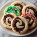 These Swirled Christmas Cookies combine classic buttery sugar cookie dough with a rich cocoa swirl to create a festive and visually stunning holiday treat. The cookies are soft, slightly chewy, and adorned with powdered sugar and colorful red and green sprinkles, making them perfect for holiday gatherings and gift-giving.