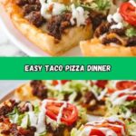 This Taco Pizza recipe combines the bold flavors of a classic taco with the comfort of a cheesy pizza. Ground beef seasoned with taco spices is layered on a crispy pizza crust topped with cheddar and mozzarella cheeses, then baked to perfection. After baking, the pizza is garnished with fresh toppings like shredded lettuce, diced tomatoes, onions, black olives, and optional extras such as sour cream, jalapeños, cilantro, and crunchy tortilla chips, making it a fun and flavorful meal perfect for family dinners or casual gatherings.