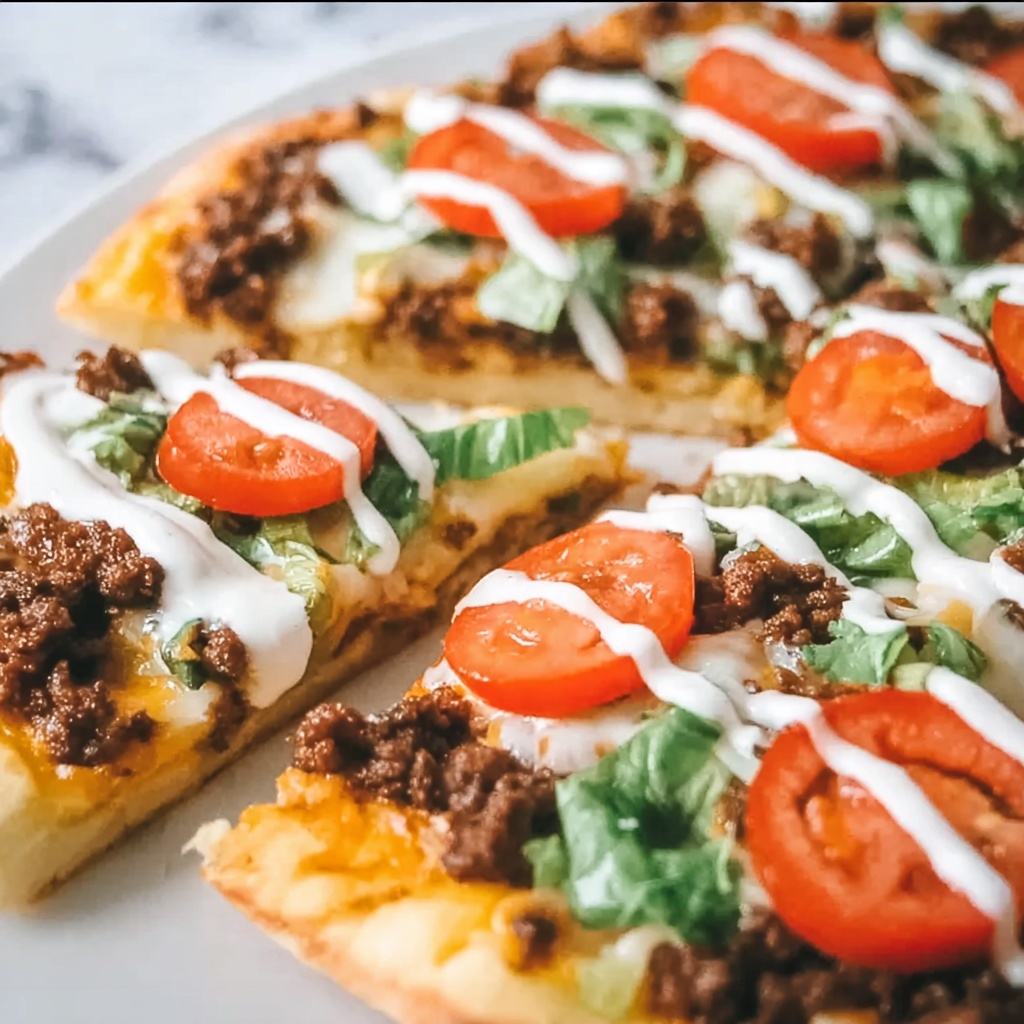 This Taco Pizza recipe combines the bold flavors of a classic taco with the comfort of a cheesy pizza. Ground beef seasoned with taco spices is layered on a crispy pizza crust topped with cheddar and mozzarella cheeses, then baked to perfection. After baking, the pizza is garnished with fresh toppings like shredded lettuce, diced tomatoes, onions, black olives, and optional extras such as sour cream, jalapeños, cilantro, and crunchy tortilla chips, making it a fun and flavorful meal perfect for family dinners or casual gatherings.
