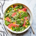 In a large serving bowl or platter, toss the marinated grapefruit with fresh watercress, diced mango, peanut oil, and lime juice. Each ingredient adds a beautiful contrast: watercress provides peppery greens, mango lends sweetness, and peanut oil offers subtle earthiness, while lime juice keeps the salad refreshingly bright.