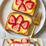 This TikTok Yogurt Toast recipe features a delightful combination of creamy yogurt custard baked atop crusty bread, topped with fresh strawberries and a touch of honey, making for a delicious and nutritious breakfast or snack.